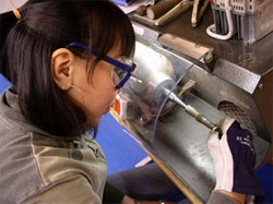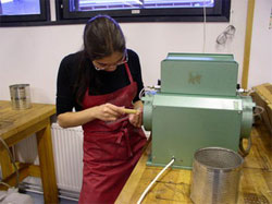 Да уж, никогда бы не подумала, что буду стоять над полировочным станком с маской на лице! Жалко, что та неделя пролетела быстро! Сейчас мы занимаемся работой над костью оленя. В общем, занимаемся всем понемногу. Сегодня закончили делать ножи для бумаги (для вскрытия конвертов, если быть точнее). Кость (нога, повидимому) оленя на опять-таки шумном, но несколько ином агрегате обрабатывается до получения нужной формы (в данном случае ножа). Потом напильником счищаются остатки мяса и будущий нож полируется наждаком, сначала с крупным зерном, потом все мелче. Сейчас на наших ножичках красуется по кожаному шнурку, которые мы тоже сплели сами.